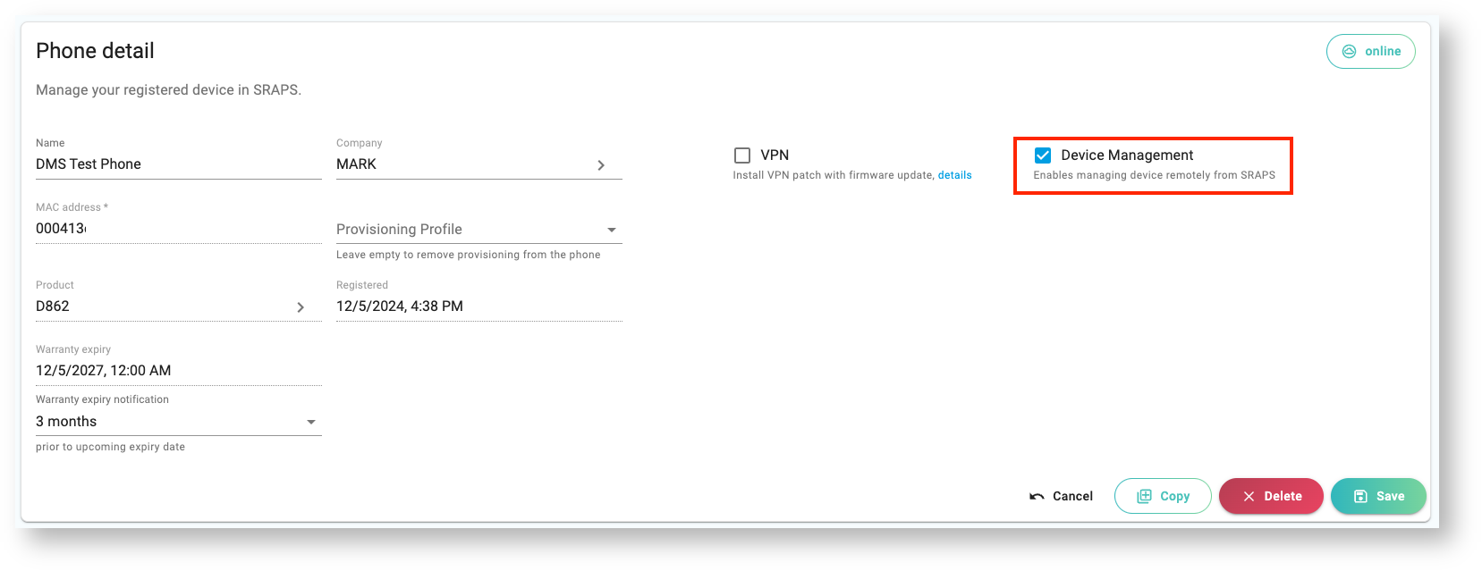 Per default, Device Manager is not activated for Snom phones. Users can either activate device manager per single phone or for a group of phones via the SRAPS portal and API.