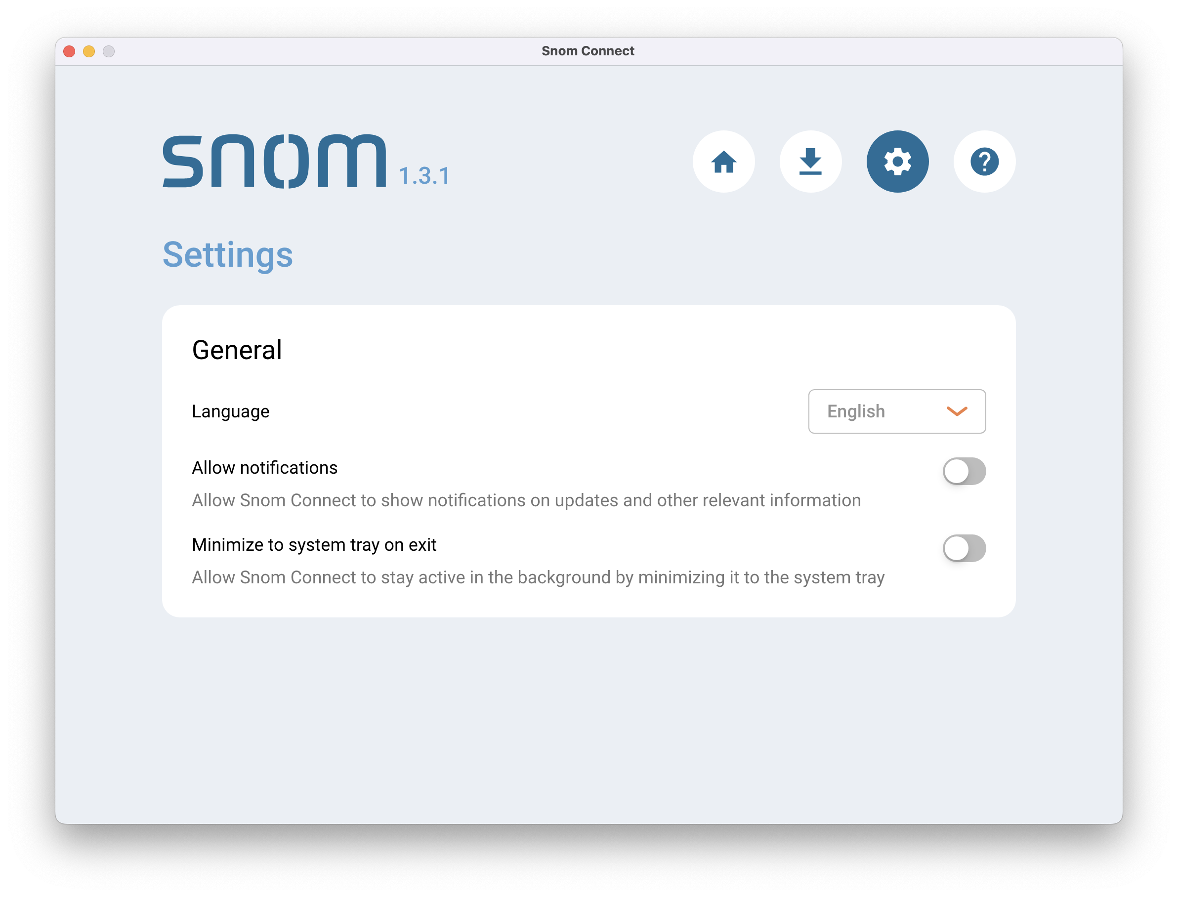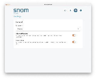 Snom Connect (PC/Desktop App) Settings | By clicking on the "gear" symbol, you can invoke the settings menu of the Snom Connect (PC/Desktop App). Here you can change the app language. | ||