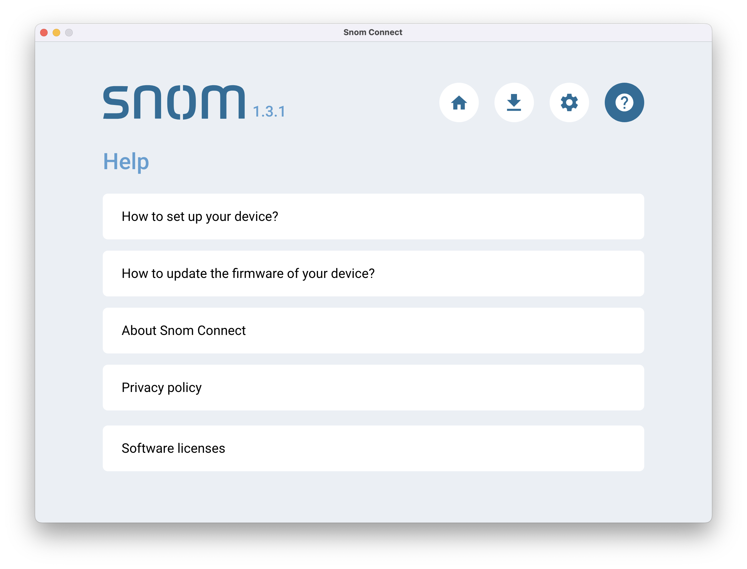 About & Help & Further information | By clicking on the "question mark" symbol, you can invoke the help menu of the Snom Connect (PC/Desktop App). By following the links you can access the device's user manual and other useful information. | ||