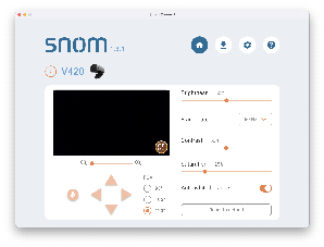 The user can set the preferred language and define the behaviour notifications and if the app should be accessible from the icons tray. | You can pair/unpair other Snom Bluetooth devices with the dongle, currently only another A350M. You can select different profiles for the sound equalizer of the A350M, e.g. Bass Boost, Thin Bass, Normal (Default setting), Thin Treble and Treble Boost | The LED lits up green, when the camera becomes operational. The camera and the microphones are now enabled and a preview window is shown. You can adapt several settings to your needs, e.g. zoom, FOV (field of view), brightness, contrast, saturation which will have an immediate effect in the preview window. | |